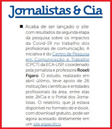 A newsletter semanal Jornalistas&Cia, editada pela Jornalistas Editora, traz em sua edição 1333, na página 28, nota sobre o site da 2ª fase da pesquisa da Covid-19 e os comunicadores.